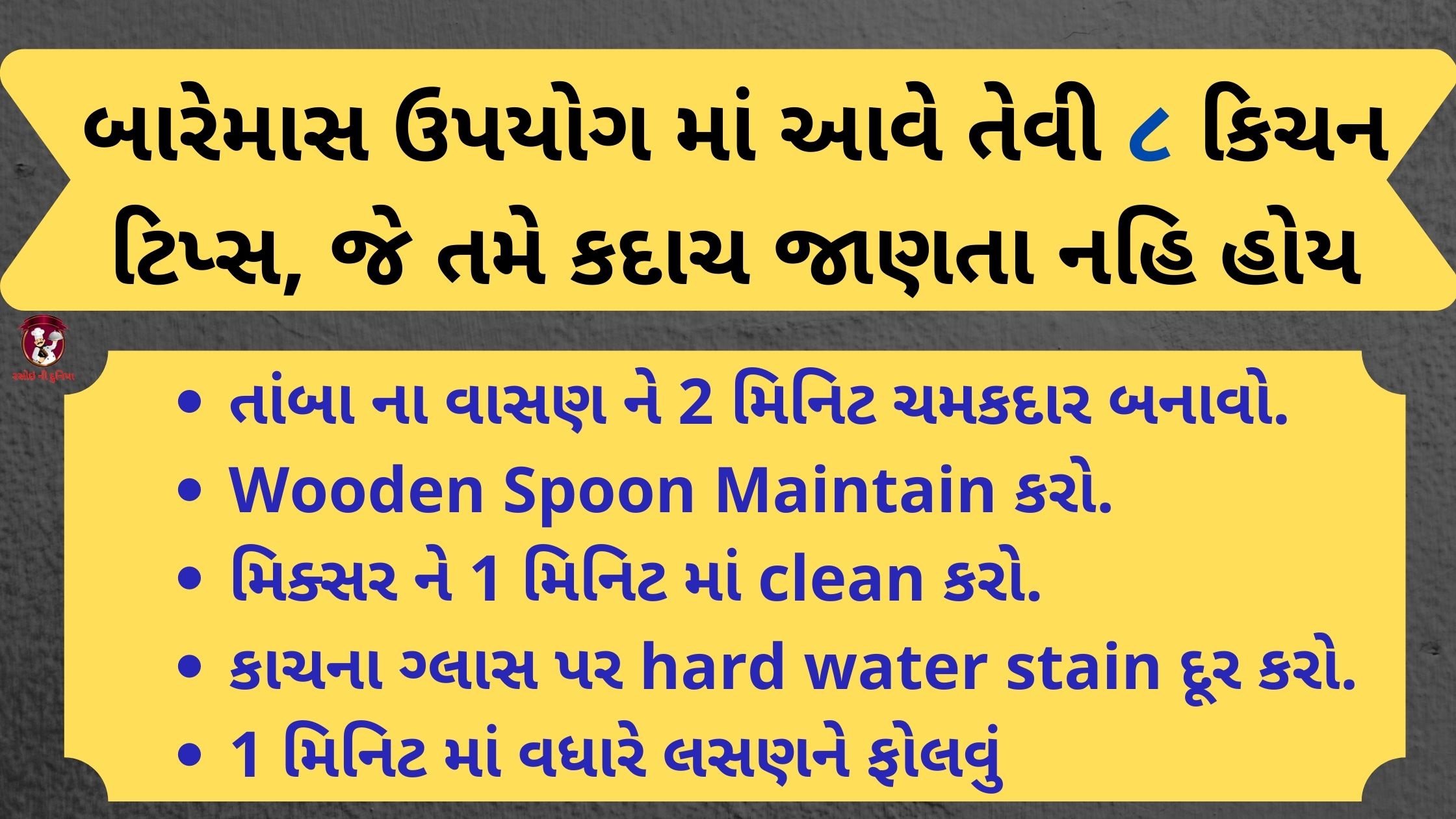આજે અમે તમને એવી ૮ કિચન ટીપ્સ વિશે જણાવીશું જે તમે કદાચ જાણતા નહિ હોય. આ ટીપ્સ જો તમને ખબર નહિ હોય તો તમે ઘણી બઘી મુશ્કેલી માં મુકાઈ જતા હસો. તો આ 7 ટીપ્સ વિશે જાણી અને આગળ તમારે મિત્રો સુઘી આ માહિતી શેર કરવાનુ ભૂલતા નહિ.