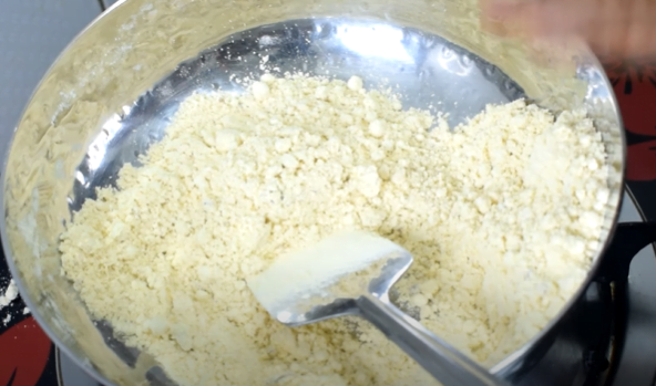 સૌ પ્રથમ એક કડાઈ ને ગેસ પર ગરમ કરવા મૂકો. તેમાં ૧ કપ બેસન એડ કરો અને તેને ૪/૫ મિનિટ શેકી લેવાનુ છે. ગેસ ધીમો રાખવાનો છે. હવે જ્યારે બેસન સેકાઈ ત્યારે એમાં થી સ્મેલ આવવા લાગશે. હવે ગેસ બંધ કરીને એક વાસણ માં આ બેસન ને કાઢી લો.
